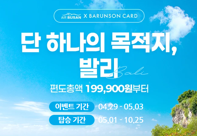 에어부산 특가 이벤트(2025.04.29~05.03, 탑승 05.01~10.25)로 부산 발리 직항을 왕복 30~40만원대에! 네이버 항공의 가격 그래프·알림으로 최저가 티켓을 잡고, 6시간 55분 만에 발리의 풀빌라, 울루와뚜 절벽, 서핑을 즐겨보세요. 부산·경남 지역민의 신들의 섬 여행, 지금 시작! 여행 계획은? 댓글로 공유!