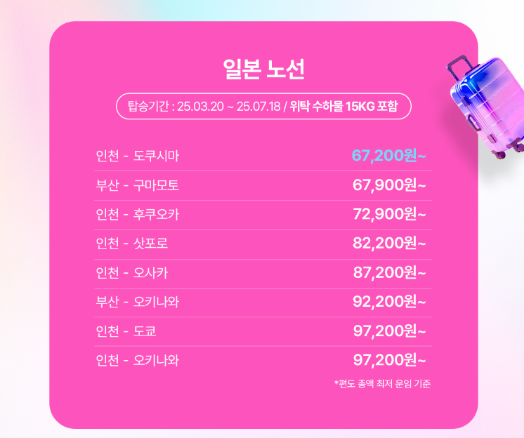 제주도, 도쿄, 방콕 등 다양한 여행지가 있으며, 저렴한 가격과 편리한 비행 일정으로 더욱 큰 행복을 느낄 수 있습니다.