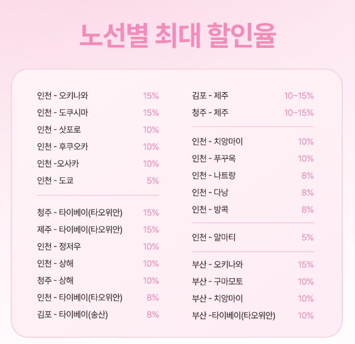 - 할인율은 노선 및 시즌에 따라 상이할 수 있습니다.