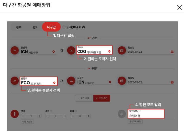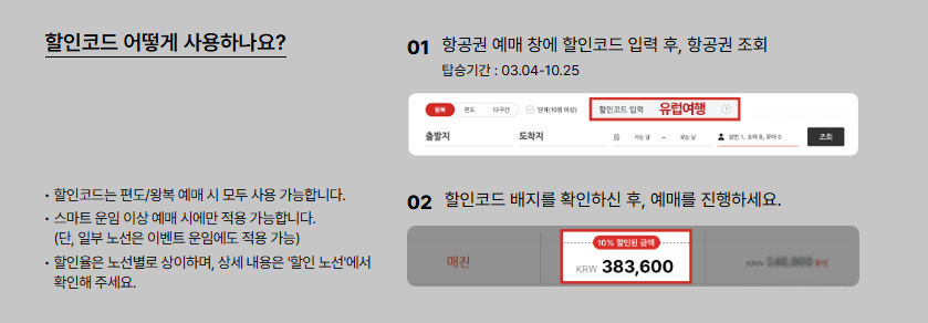 - 할인코드는 유류할증료와 공항시설 사용료 제외한 항공 운임에 적용됩니다.